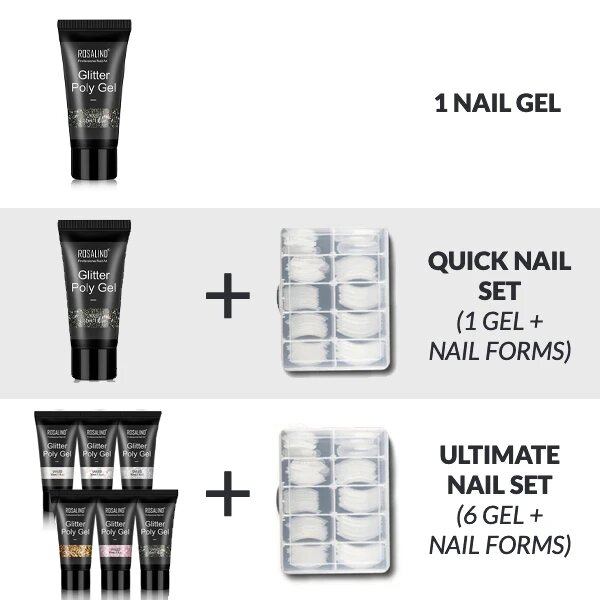 - 1 × PolyGel Nail , 1 × مجموعة أظافر سريعة (1 جل + أشكال أظافر) 1 × مجموعة أظافر ألتيميت (6 ألوان + أشكال أظافر)