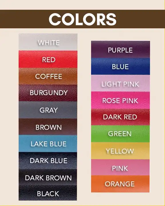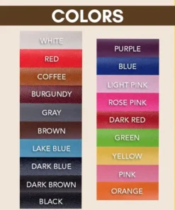 - اللون: أسود، بني غامق، أزرق داكن، أزرق بحيرة، بني، رمادي، عنابي، قهوة، أحمر، أبيض، برتقالي، وردي، أصفر، أخضر، أحمر غامق، وردي وردي، وردي فاتح، أزرق، أرجواني