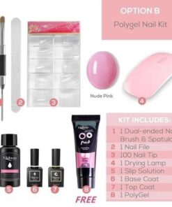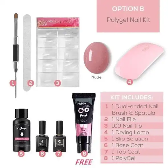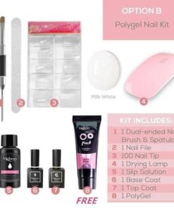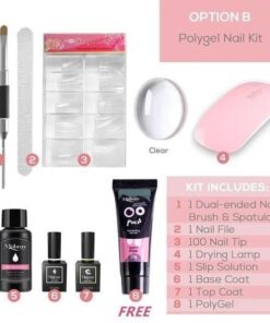 - 1 جل بولي، 1 مبرد أظافر، 1 فرشاة أظافر وملعقة ذات طرفين، 1 طبقة أساسية، 1 طبقة علوية، 1 محلول انزلاقي، 100 طرف أظافر(10 قطع من 0-9، قابلة لإعادة الاستخدام)يتضمن قوالب أظافر على شكل نعش، 1 ضوء للأشعة فوق البنفسجية للتجفيف