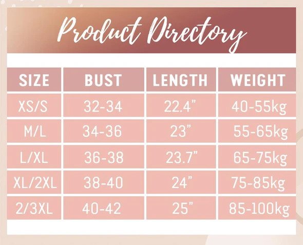 - المقاس: XS/S، M/L، L، XL، XL/2XL، 2XL/3XL